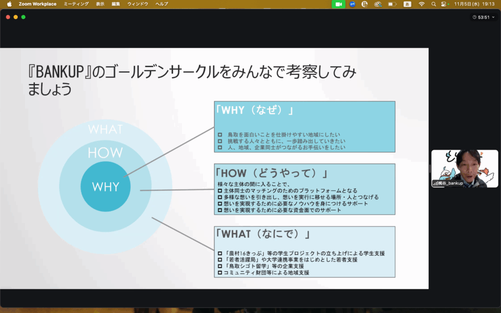 オリエンテーションもほどほどに、事前の課題として取り組んでいただいた「ゴールデンサークル」へのフィードバックへ。まずは、鳥取県から参加のbankupさんを例に取り上げ、3つのグループにわかれて色々な角度から考察してみました。