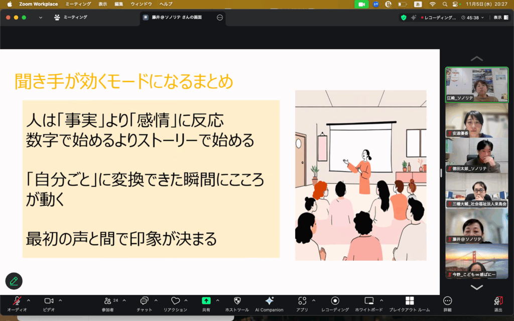 12月21日に開催する『NPOサミット2025ー共感から共鳴へー』に先駆け、参加団体の皆さんと共に「NPO・NGOのための ブランディング&プレゼンテーション ワークショップ」(全3回)の第2回を11月5日(水)に実施いたしました。今回は、前回WSで藤井さんより紹介のあった「ゴールデンサークル」に事前に取り組んでいただきましたので、そちらへのフィードバックおよびプレゼンテーションのtipsを学びました。