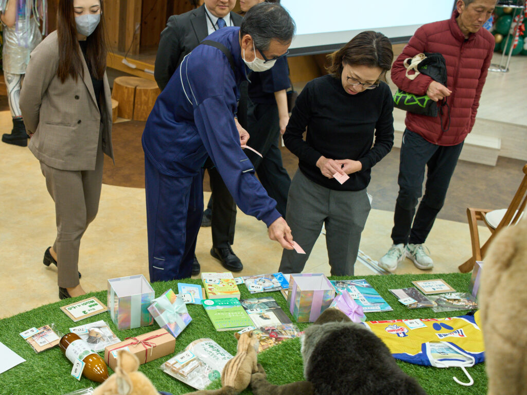 チャリティーラッフルの様子です。当日、1枚500円で追加購入も可能な福引。3万円のご寄付が集まりました。商品をご提供いただいた協賛社の皆さま、ありがとうございました。